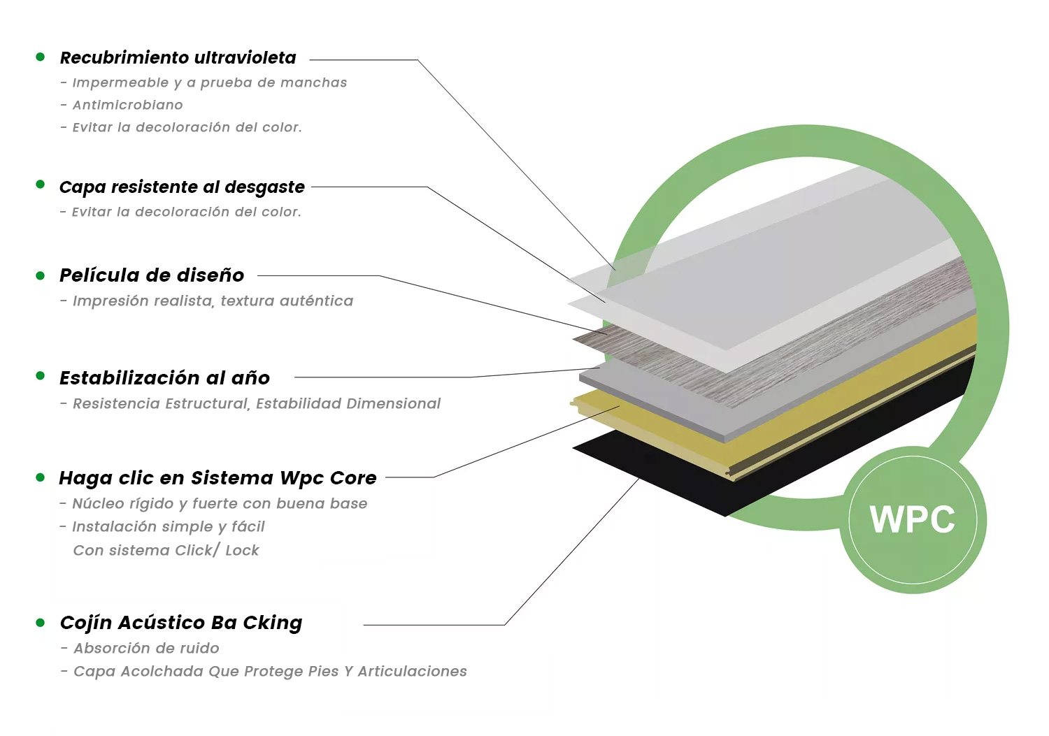 El azulejo compuesto de madera y plástico presenta una estructura de 6 capas. Su núcleo de WPC está diseñado con propiedades amortiguadoras que promueven la comodidad al caminar y es ideal para los hogares.